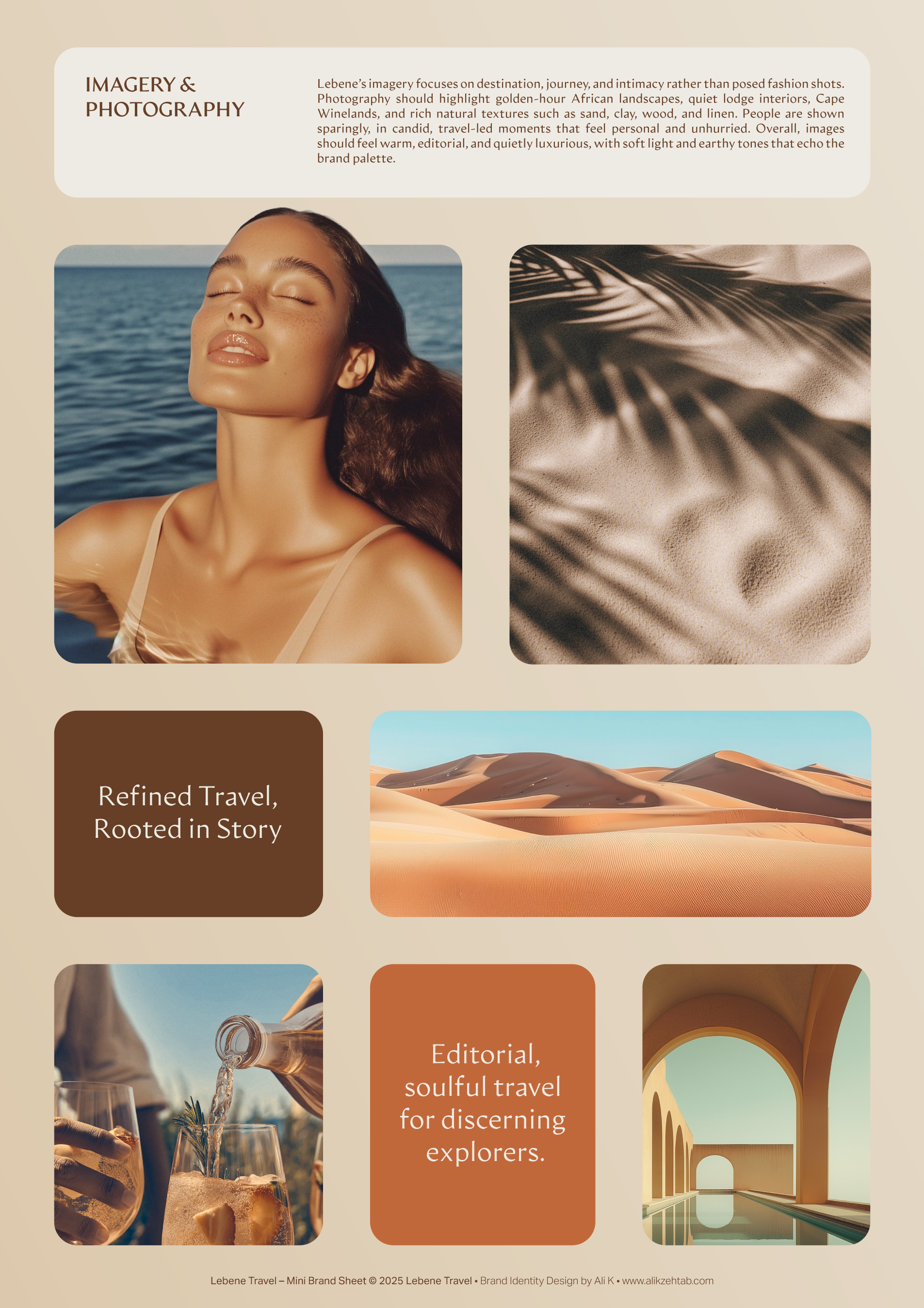 Imagery focuses on destination and journey rather than fashion-style portraits: golden-hour landscapes, boutique lodges, Cape Winelands, natural textures (sand, clay, wood, linen) and candid travel moments. This photography direction anchors the brand in Africa while keeping the overall mood intimate, considered and upscale.