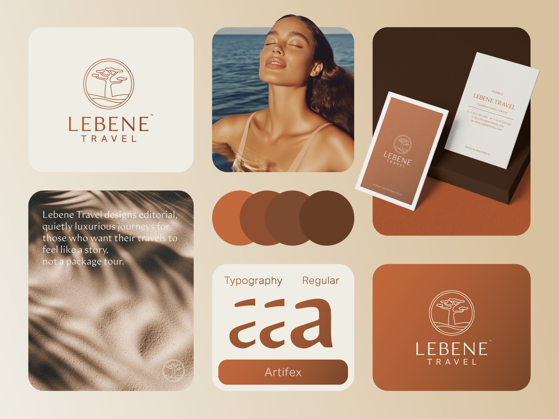 Lebene Travel needed a premium, editorial brand identity that felt warm, soulful and quietly luxurious—far from cliché safari clipart. The goal was to create a minimalist baobab logo and wordmark that could live comfortably across a luxury travel website, social media, email newsletters and bespoke travel itineraries.