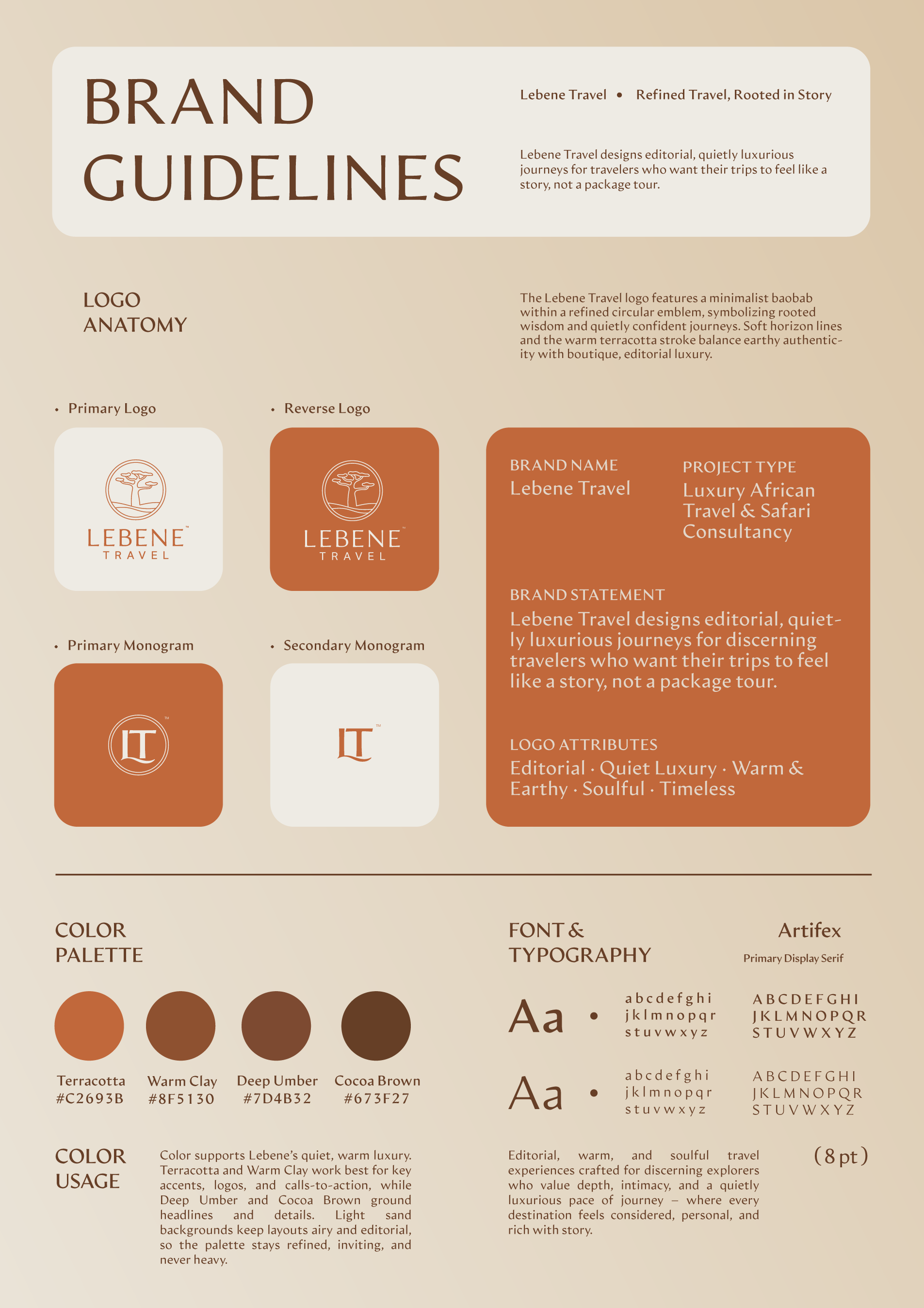To support consistency as the brand grows, I created a concise mini brand sheet that documents the logo system, color palette, typography and imagery guidelines. This gives Lebene Travel a clear foundation for future applications—from website design to print collateral and marketing assets.